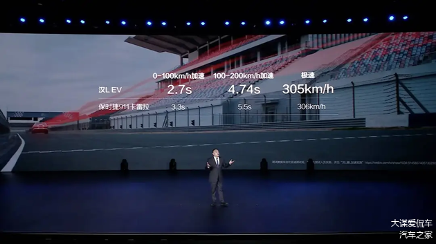 性能是汉L和唐L的最大卖点。汉L纯电版搭载双电机,综合功率1086马力,零百加速仅2.7秒,极速305km/h;唐L纯电版零百加速3.6秒,极速287km/h。发布会上,比亚迪直接拉出保时捷911对比——汉L的加速和极速均超过911 Carrera(3.9秒、293km/h)。