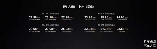 4 月 9 日,比亚迪旗下备受瞩目的两款全新车型 —— 汉 L 和唐 L 正式上市,汉 L 此次推出插混、纯电共 6 款配置车型,指导售价区间为 20.98 万 - 27.98 万元。唐 L 共计推出 6 款车型,售价 22.98 - 28.98 万元。