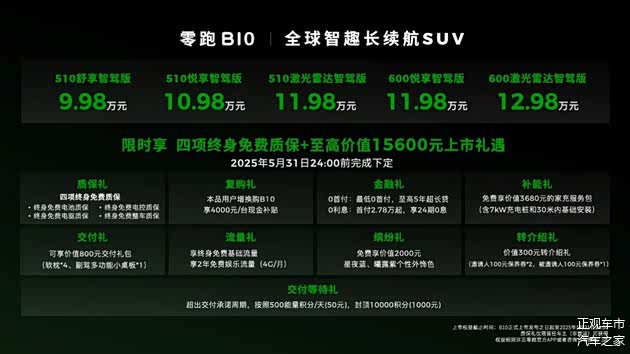 2025年4月10日,零跑汽车全新B系列首款全球化车型—— 零跑B10正式上市。新车共推出5款车型,包括510km和600km两种CLTC续航版本,其官方指导价格区间为9.98万元至12.98万元。作为一辆紧凑型SUV,零跑B10入门版车型续航就拔高到了用户更需要的500公里级别,做到了同级领先水平。同时,搭载激光雷达+高通双旗舰芯片的高配车型做到了11万级,且软件可通过OTA持续免费升级。智能硬件拉满,品质保障也可靠,电池、电驱、电控、整车四项终身免费质保都给到用户,真正做到“科技平权,好而不贵”,让卓越触手可及。