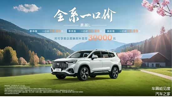 *活动时间:4月1日-4月30日;*一口价为豪越L指导价减去现金优惠后的价格;*政企双补至高30000元=限时换新礼15000元+国家以旧换新补贴至高15000元;*国家以旧换新补贴享受条件须符合《商务部等8部门办公厅关于做好2025年以旧换新工作的通知》等国家相关部门发文要求;*手机APP远程控制所需流量属于基础流量,其余均属于非基础流量,流量权益到期后需自行续费使用,需用流量的配置/功能详见官方配置表;*具体优惠详询当地经销商。