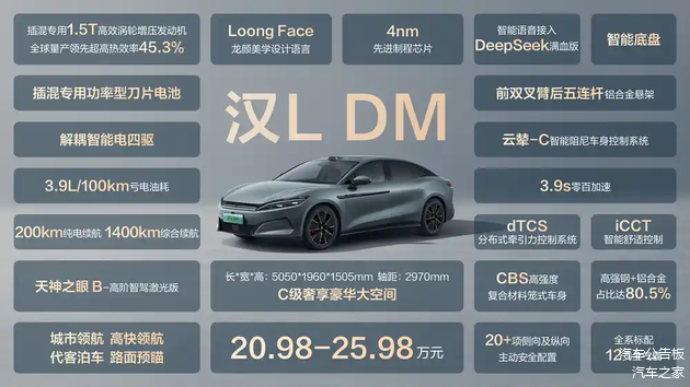 4月9日,比亚迪汉L正式上市了。新车依旧拥有插混和纯电两个版本,各推出了三款车型,其中插混版20.98万起,纯电版21.98万起(具体价格可看下图)。据悉,新车基于比亚迪超级e平台打造,能实现1000V高压平台、1000瓦超充功率,零百加速最快2.7秒,而汉L DM版本则会配备第五代DM技术。新车依旧定位中大型轿车,上市后会和现款在售的汉同堂销售。