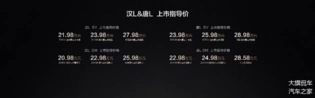 前不久比亚迪技术发布会上,比亚迪王朝网双旗舰车型比亚迪汉L以及 唐L也随之亮相,并且开启预售。4月9日,备受瞩目的王朝网双旗舰车型汉L、唐L迎来正式上市,其中汉L EV共推出3款配置车型,售价21.98万元-27.98万元;汉L DM共推出3款配置车型,售价20.98万元-25.98万元;唐L EV同样推出3款配置车型,售价区间23.98万元-28.98万元;唐L DM同样推出3款配置车型其中包含无人机版本,售价区间22.98万元-28.58万元。