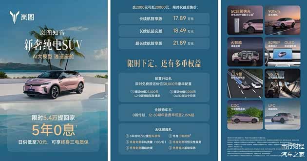 在4月30日前,下定岚图知音的用户,有“交2000抵20000元”的优惠,限时权益售价17.89万元起。此外,岚图知音还为消费者提供了更加优惠的政策,5年0息,仅需5.4万即可提回家,日供低至70元,还有终身三电质保。配置升级礼、金融购车礼、无忧保障礼,可谓诚意满满。如果你也在选购一台20万级别的纯电SUV,岚图知音就是那个不容错过的选择。