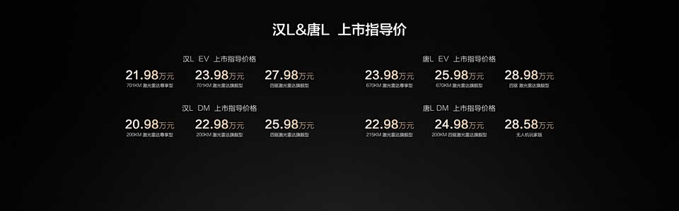 4月9日,比亚迪汉L正式上市,新车推出6款车型,售价20.98-27.98万元。汉L基于比亚迪超级e平台打造,能实现1000V高压平台,1000瓦超充功率,5分钟充电400km,30511rpm量产最高驱动电机转速,单电机最大功率580千瓦,0-100km/h加速最快2.7秒。插混车型拥有第五代DM技术,配备DiDyna智能底盘、天神之眼B高阶智驾。外观上,新车采用最新的“Loong Face”设计语言,车顶配备有激光雷达,风阻系数仅为0.212。车身尺寸长宽高分别为5050/1960/1505mm,轴距为2970mm。车内汉L与唐L采用了相似的设计,采用仪表屏+HUD抬头显示+悬浮式中控屏组合,配备DiLink超感交互智慧座舱,DiLink 150高阶版,全场景智能语音AI大模型,多场景情景模式,5G,DeepSeek满血版。智驾配备天神之眼B(DiPilot 300)系统,其由1颗激光雷达、5颗毫米波雷达、12颗超声波雷达以及多个摄像头组成。