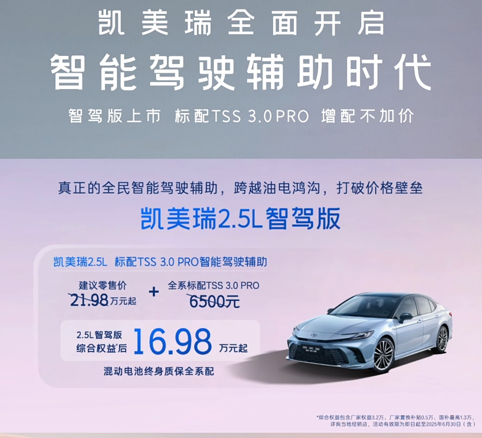 广汽丰田凯美瑞智驾版上市,指导价21.98万元起,新车基于双擎2.5HG尊贵版、双擎2.5HXS运动Plus版配置升级而来。当前购车提供价值5万元综合权益,综合权益价16.98万元起,