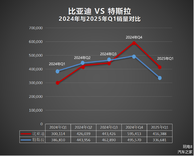 那么,2025年一季度特斯拉销量同比下降13%,只有33.67万辆,比迪子的纯电41.64万辆少了8万辆,那真是自己的问题了。