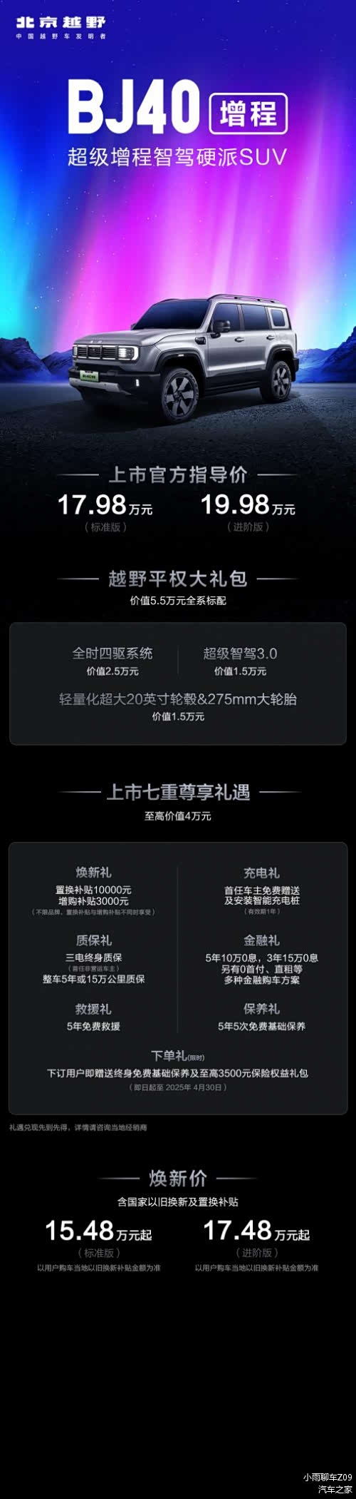 4月9日, 北京越野BJ40增程上市1小时订单突破3000辆,48小时订单突破10000辆。凭借越野平权理念、上市七重尊享礼遇以及千亿研发制造投入等,BJ40增程迅速赢得了消费者的青睐。BJ40增程定位为超级增程智驾硬派SUV,已于4月7日正式上市,提供标准版和进阶版两大车型选择,官方指导价为17.98万-19.98万元,焕新价最低15.48万元起(叠加国补和置换补贴后),为用户开启全新的硬派生活。