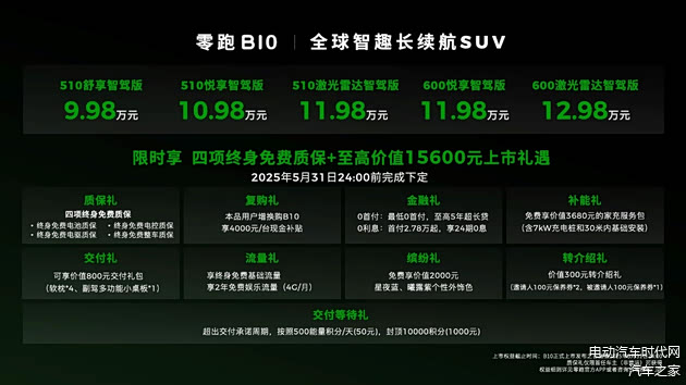 2025年4月10日,零跑汽车全新B系列首款全球化车型—— 零跑B10正式上市。新车共推出5款车型,包括510km和600km两种CLTC续航版本,其官方指导价格区间为9.98万元至12.98万元。作为一辆紧凑型SUV,零跑B10入门版车型续航就拔高到了用户更需要的500公里级别,做到了同级领先水平。同时,搭载激光雷达+高通双旗舰芯片的高配车型做到了11万级,且软件可通过OTA持续免费升级。智能硬件拉满,品质保障也可靠,电池、电驱、电控、整车四项终身免费质保都给到用户,真正做到“科技平权,好而不贵”,让卓越触手可及。