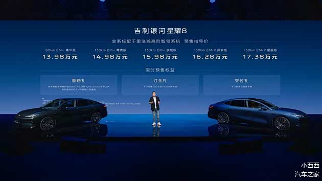 4月10日,吉利 银河星耀8启动预售。新车推出搭载雷神EM-P超级电混和雷神EM-i超级电混的双动力版本,共计5个版型,预售指导价13.98~17.38万元。