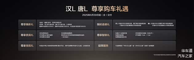 伴随唐L的上市,比亚迪王朝网还准备了七重购车礼遇。截至6月30日24:00前完成购车开票,用户可享尊享金融礼,0首付、0利息任选其一;尊享置换礼,置换补贴至高35000元;还有尊享无忧礼、尊享贵宾礼、尊享智联礼、延保服务可选。其中,尊享置换礼中除了至高20000元国补,更有首销期限时置换补贴10000元,同时比亚迪老车主额外可享5000元置换补贴加码!此外,用户额外可享限时选装礼,包括价值6000元的墨竹青外观免费选装、价值4000元的霞绯红内饰免费选装。尊享购车礼遇加持,进一步降低消费者的购车用车成本,让更多年轻用户畅享旗舰级出行体验。