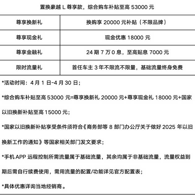 4月,家庭出行的革新之选——吉利豪越L震撼来袭!全系"一口价"政策重磅推出,叠加政企双补,综合补贴至高53000元,让这款实力派大7座SUV的门槛进一步降低。作为大家庭全能SUV的不二之选,豪越L凭借"可5可6可7"的灵活空间变换能力、全系标配的2.0TD豪华动力系统以及同级领先的智能座舱配置,正在重新定义12万级大7座SUV市场的价值标准,成为当之无愧的"性价比之王"。无论家庭出游还是都市通勤,豪越L都能满足您对品质生活的全方位追求。