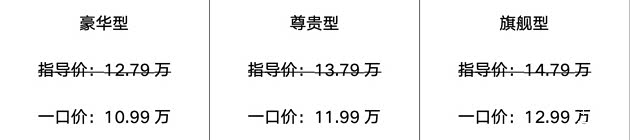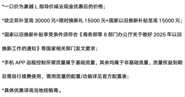 豪越L此次推出的“全系一口价”政策,覆盖豪华型、尊贵型、旗舰型三款配置,官方指导价12.79万-14.79万元,限时优惠后售价分别为10.99万、11.99万、12.99万,豪越L尊享款则可享综合购车补贴至高53000元。
