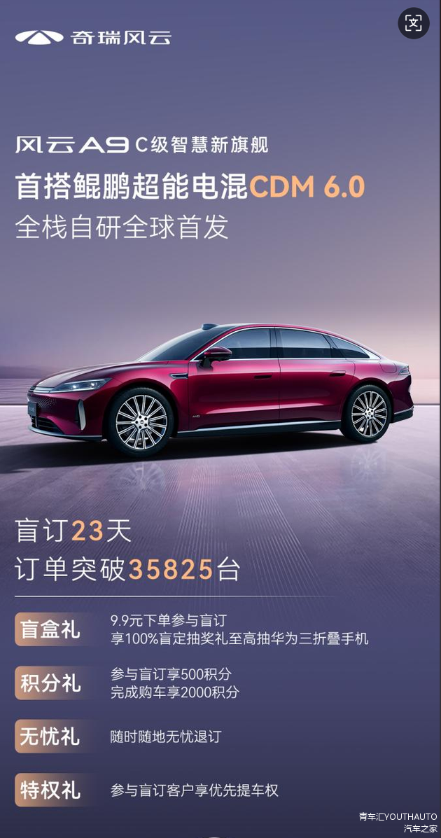 奇瑞“混动之夜“上风云A9的盲订政策依旧诚意满满,只需9.9元即享四重尊享权益: