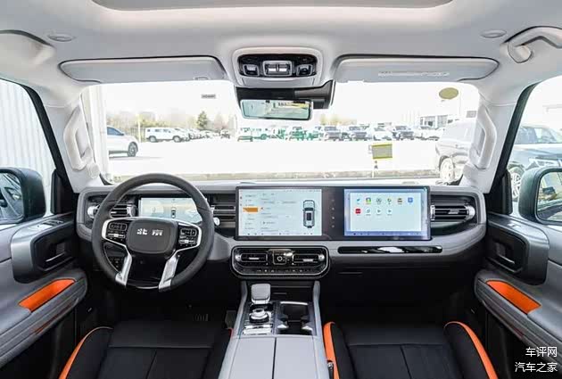 内饰方面,BJ40增程版采用双联屏设计,标配10.25英寸液晶仪表、12.8英寸中控屏和副驾屏,以及9英寸流媒体后视镜。车机系统搭载高通骁龙8155芯片,支持AI语音交互。舒适配置方面,前排座椅配备加热、通风和按摩功能,高配车型还搭载了Infinity 12扬声器音响系统。
