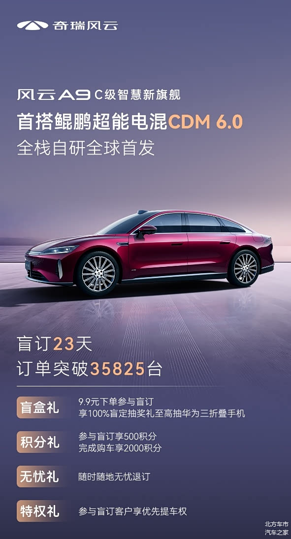 重构旗舰标准,普惠全球用户。4月10日,C级智慧新旗舰—— 风云A9于奇瑞“混动之夜”上持续开启盲订。自3月18日奇瑞“智能之夜”开启盲订以来,风云A9仅用23天订单量已突破35825台,展现出中国品牌冲击高端市场的强劲势能。作为奇瑞风云序列的扛鼎之作,风云A9以鲲鹏超能电混CDM 6.0技术为核心,集领先技术、全域安全、精准操控与舒享驾乘于一身,不仅重构了40万级C级混动旗舰的标准,更以全球领先的技术,向世界证明了中国智造的硬核实力。