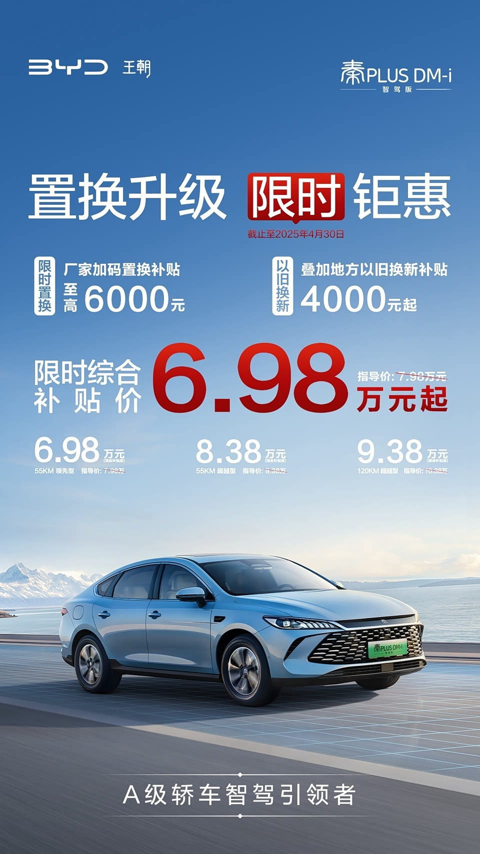 真够狠,比亚迪又出招了。比亚迪王朝网销售事业部总经理路天今日在微博上宣布,推出置换升级优惠活动,第二代秦 PLUS DM-i 智驾版限时综合补贴价 6.98 万元起。不过55km纯电续航确实短了点,这车买起来基本当混动车来开。