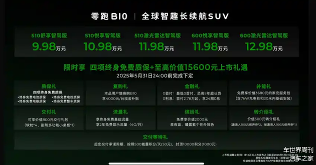 零跑B10此次共推出了5款配置车型,分别为510舒享智驾版、510悦享智驾版、510激光雷达智驾版、600悦享智驾版、600激光雷达智驾版。从命名也能看出,几款车型在动力续航以及智驾水平上有所不同,您可以根据预算和需要进行选择。