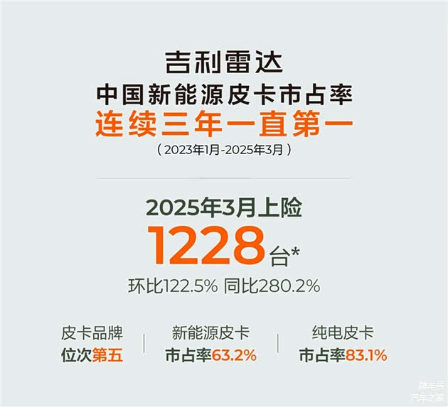 3月皮卡市场的天,吉利雷达又捅破了一层。根据中汽中心的最新数据,吉利雷达1228台上险量,环比涨幅122.5%,同比暴涨280.2%。全品类上险量冲进第五,突破历史新高,市占率更是达到4.1%,再次创新记录。这不是一次爆量,实际是在重塑用户认知。