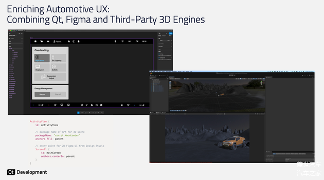 我们始终强调,Qt不仅仅是一个HMI框架,更是一个具备高度兼容性的平台。下图左侧图片展示了在Figma中完成的2D设计,右下角则是Unity引擎构建的场景,通过简单的两行代码,Qt便能实现对Figma设计的支持以及Unity场景的集成。这一效果展示了Qt作为框架的灵活性,它能够打包成APK文件,通过Qt框架实现2D渲染,并与其他引擎无缝集成。事实上,许多车企已采用Qt作为框架基础,利用其进行2D渲染,并方便地复用素材到其他引擎中。
