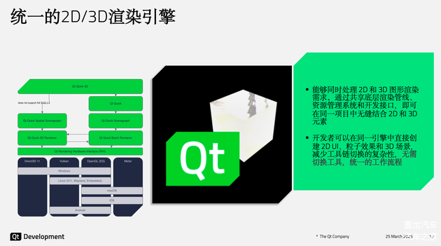 我们不禁要问,Qt究竟提供了哪些独特价值,能够赢得这些国际知名OEM的青睐?首要原因便是Qt引擎的独特性——它是一个完整且统一的2D与3D渲染引擎。对于技术人员而言,采用单一的3D引擎进行开发时,往往会遇到这样一个难题:当需要在3D界面上叠加2D触控或操作元素时,这些2D内容往往无法由3D引擎直接提供,而需要引入第三方的2D解决方案。这种做法会导致2D与3D内容无法在同一渲染上下文中进行,从而引发同步与效率方面的问题。在Qt的引擎中,这些问题将不复存在。Qt提供了一个统一的设计工具,能够轻松应对2D与3D的渲染需求,无需担心上下文不一致的问题。