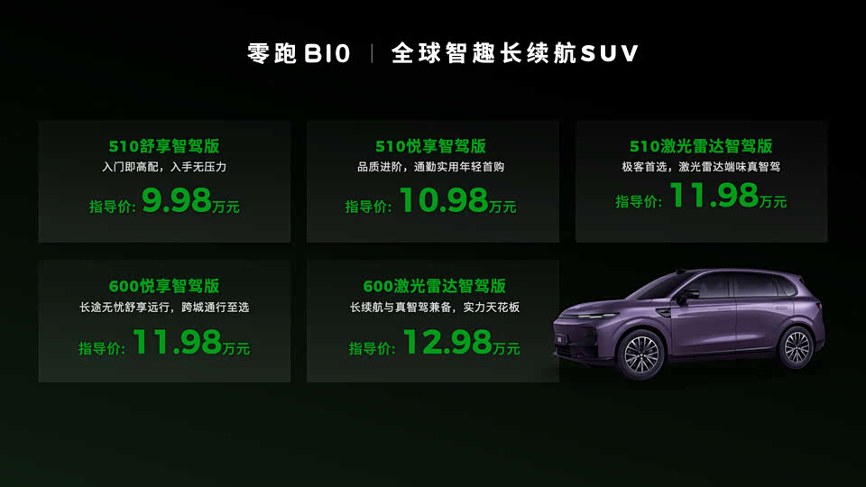 B10起售价9.98万元,顶配激光雷达版12.98万元,全系提供电池、电驱等四项终身质保(限首任车主)。