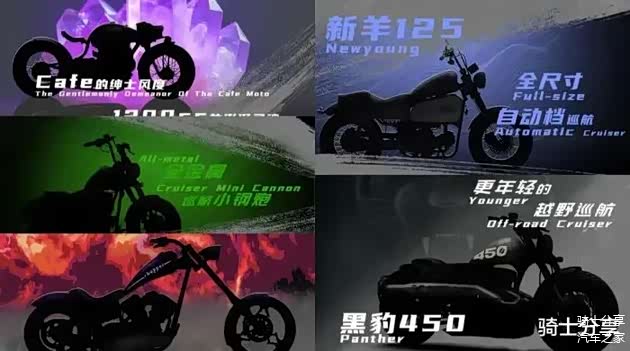 作为全新品牌私奔一口气带来了多款新车,它们分别是自动挡巡航车新羊125、小象300mini、越野巡航黑豹450、火烈鸟700、咖啡骑士1200以及一款拳击手引擎。