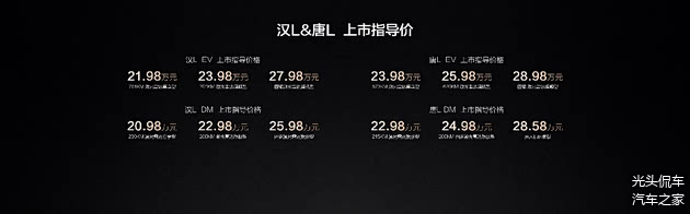 4月9日,比亚迪划时代旗舰轿车 汉L正式上市,共推出汉L EV、汉L DM两大车系。新车长宽高分别为5050*1960*1505mm,轴距2970mm,是标准的C+级轿车。其中,汉L EV坐拥701KM激光雷达尊享型、701KM激光雷达旗舰型、四驱激光雷达旗舰型;汉L DM坐拥200KM激光雷达尊享型、200KM激光雷达旗舰型、四驱激光雷达旗舰型。新车提供4种外观颜色及2种内饰配色,售价为20.98万~27.98万元。