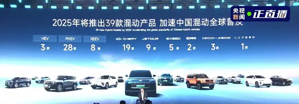 奇瑞计划在2025年推出39款混动产品,包括3款HEV、28款PHEV以及8款REEV车型。