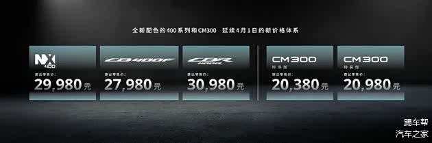 除了400系列车型全新配色方案外,Honda还发布了CM300特装版,该版本新增了大灯灯罩、菱格纹坐垫,并在摩登灰车身上加入薄荷绿线条,官方建议零售价为20,980元。而400系列新配色和CM300标准版车型将延续4月1日实施的新价格体系。