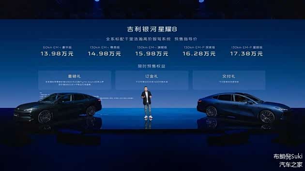 4月10日,全球新一代豪华中大型电混轿车吉利 银河星耀8启动预售。新车推出搭载雷神EM-P超级电混和雷神EM-i超级电混的双动力版本,共计5个版型,预售指导价13.98~17.38万元。