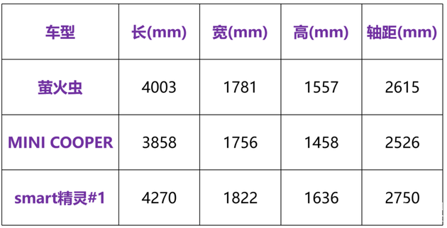萤火虫是一台标准的4米级车型,级别上归为A0级小车,体量上比MINI COOPER大,比smart精灵#1更小,且不管是轴距还是车身长度,萤火虫都差不多处于两款车型中间。