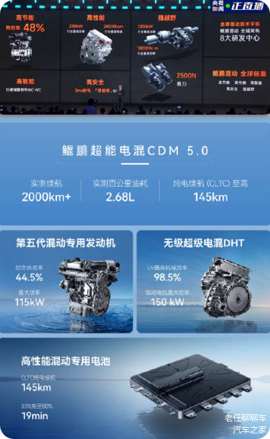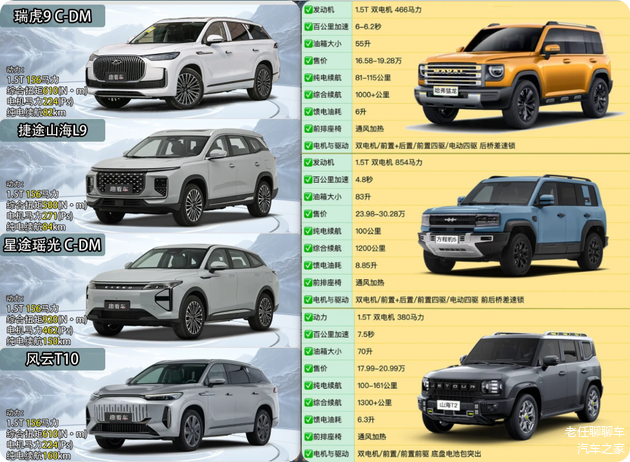 风云T10:搭载鲲鹏CDM 5.0混动系统,1.5T发动机热效率44.5%,四驱版综合功率455kW,零百加速4秒级,CLTC纯电续航210km(四驱200km),亏电油耗4L/百公里,创吉尼斯2169km超长续航纪录。