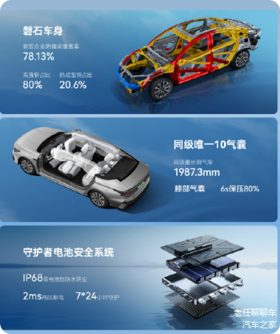 全系标配磐石车身结构(高强钢铝占比80%以上)与锁子甲电池安全系统,AEB刹停时速达120km/h,亏电状态下180km/h高速行驶不失速。