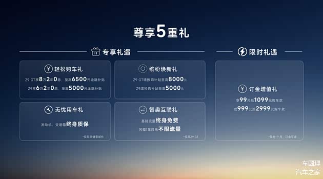 还提供了包括最高8万2年0息,至高6500元金融补贴、增换购至高8000元补贴、发动机变速箱终身质保、999元定金抵2999元购车款等在内的“尊享五重礼”。