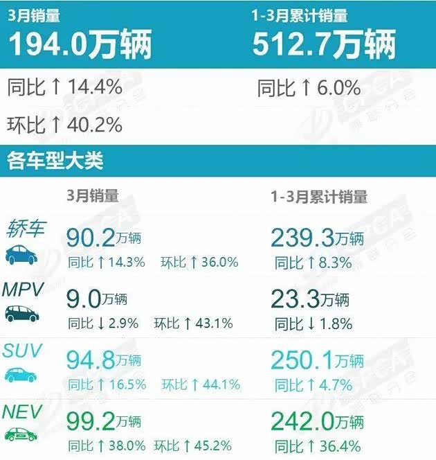 伴随着春节假期结束,国内车市回归正常,3月份国内乘用车销量数据也出现明显增长。据乘联会最新销量数据显示,3月份国内狭义乘用车市场零售销量达194.0万辆,同比增长14.4%,环比增长40.2%;1-3月份累计销量512.7万辆,同比增长6.0%。