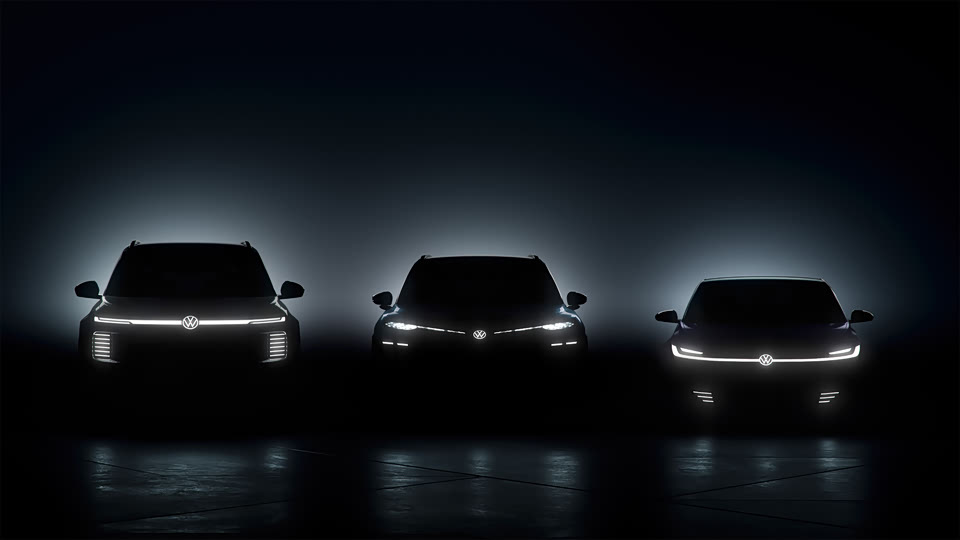 2025上海车展,大众汽车将发布三款全新车型:一汽-大众基于CMP平台和CEA架构的紧凑型纯电轿车,上汽大众全尺寸增程式SUV以及大众安徽ID. 与众品类下的全新全尺寸纯电SUV。 图中最左侧的应该是ID.与众的新车,最右为采用新平台和新架构的一汽-大众纯电轿车。