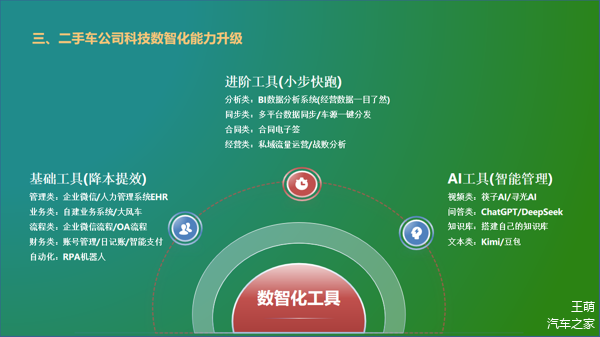 二手车企业化,不再是老板一个人“孤胆英雄”的吕布项羽,而是要组织体系和现代化工具结合,否则不如老板自己背包客,越打越累越难。基础+进阶+人工智能工具,配套团队组织,就日益强大的可能出现了。2025年的中国二手车,从资源时代走向运营时代,原有的单纯差价模式不要再幻想收到便宜车,卖到高价格,概率越来越小,粗放管理的风险概率反而越来越高,唯有降本增效才能实现企业真正的成长和盈利。