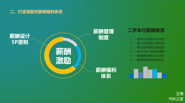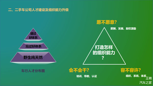 目前中国二手车行业普遍存在公司老板是人物,公司团伙有人手,但是人才和团队难以做到降本增效,很多公司看似销售数量不少,但是整体团队人均贡献也就是2-3台,各类成本和风险都在不断提高,盈利水平持续下降。现有二手车企业老板们最头疼的就是体系化管理,提高组织能力和人效问题。大部分老板们“草莽出身”江湖风格,野生纯天然,顺势的时候,兄弟们“听大哥”的,吃肉喝酒泡妞好不惬意,但是遇到困难和挫折,就难团结协作,类似当年民国的土匪山头,难以发展壮大。部分新生代的二手车开始“企业化”,这部分企业有不少是原来汽车4S店体系出身,二手车电商,或者大企业中高层管理创业,见过好的体系,经历过系统化培训,有一定的认知理解,这也是目前中腰部二手车企业发展的优势之一。但是企业再壮大,月销超过50台,团队超过20人的时候,就需要更多的组织管理科学和人性管理“玄学”了。整个组织的系统和体系建设,而不是碎片化,要串联起来;岗位职责的培训、跟进、认证,持续进化;员工的薪酬、福利、发展、激励,股权期权等等。不但要“画饼“,而要真的让员工和团队吃到饼!