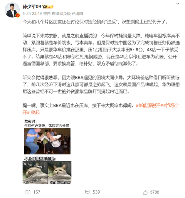 由于车市内卷,宝马汽车没那么好卖了,宝马经销商库存压力大,被迫降价卖车,快速回笼资金。但经销商的内卷,导致售价越来越低,赚不到钱的经销商就暴雷了。此前,保时捷经销商就发起了“造反”运动。