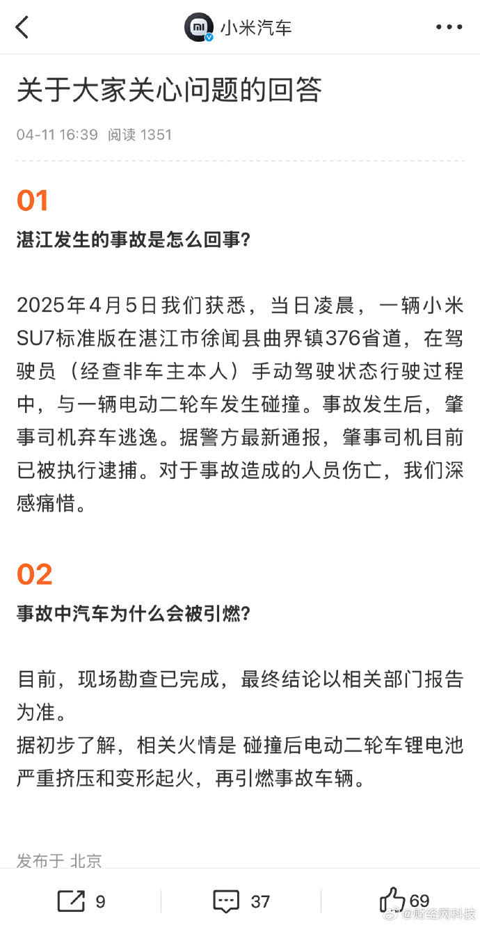 小米汽车回应湛江事故 4月11日,小米汽车官方回应湛江事故。 小米汽车表示:“2025年4月5日我们获悉,当日凌晨,一辆小米SU7标准版在湛江市徐闻县曲界镇376省道,在驾驶员(经查非车主本人)手动驾驶状态行驶过程中,与一辆电动二轮车发生碰撞。事故发生后,肇事司机弃车逃逸。据警方最新通报,肇事司机目前已被执行逮捕。对于事故造成的人员伤亡,我们深感痛惜。目前,现场勘查已完成,最终结论以相关部门报告为准。据初步了解,相关火情是 碰撞后电动二轮车锂电池严重挤压和变形起火,再引燃事故车辆。”