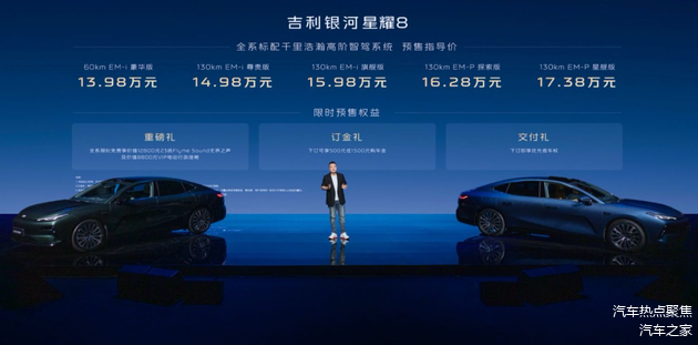 吉利 银河星耀8以13.98万起售价开启预售,满配权益+越级体验,直接对合资燃油车发起降维打击。预售权益壕无人性,音响座椅白送。下订即送价值12800元的23扬Flyme Sound音响+8800元VIP行政座椅,权益总额超2万元。