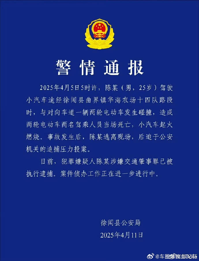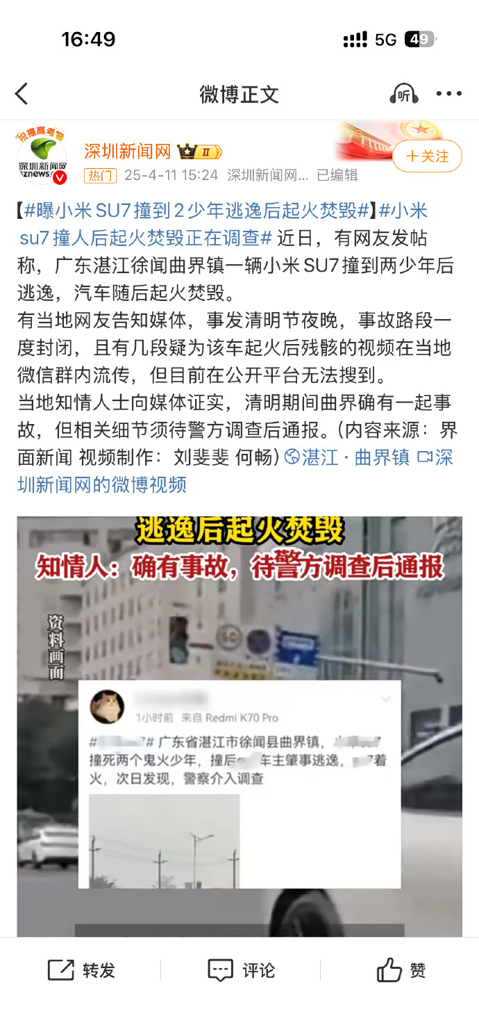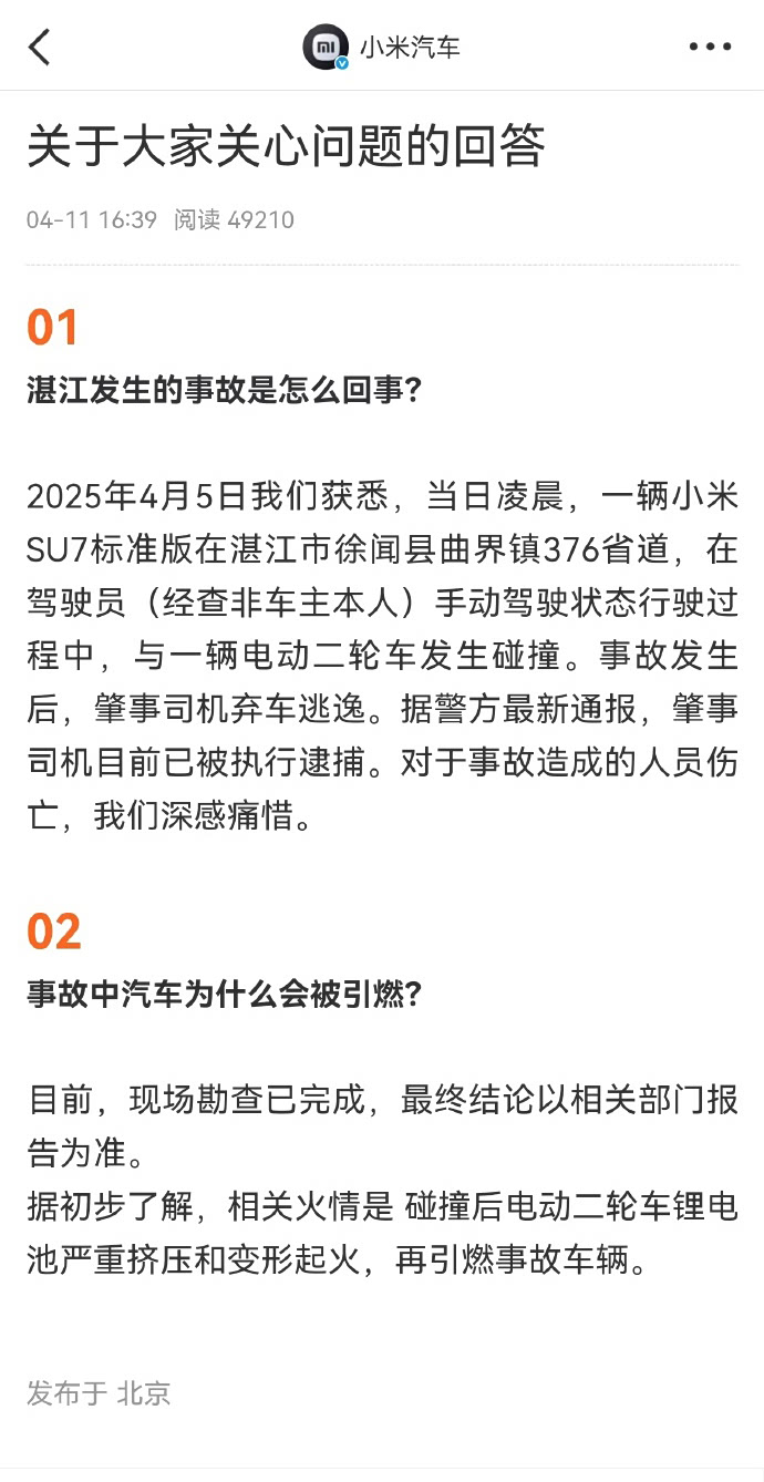 【小米汽车, 警方通报 各自发布!】 2025年4月5日,一辆小米SU7标准版,在湛江市,与一辆电动二轮车相撞,事故发生后肇事司机逃逸。碰撞后电动二轮车锂电池严重挤压变形起火,再引燃小米SU7。 事发时,SU7处于手动驾驶状态。