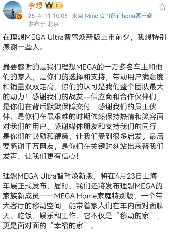 4月11日,理想汽车创始人李想发布微博,透露了纯电旗舰MPV新款理想MEGA相关信息。理想MEGA Ultra智驾焕新版,将在4月23日上海车展正式发布,届时还将发布理想MEGA的家族新成员——MEGA Home家庭特别版。