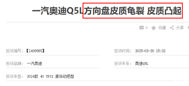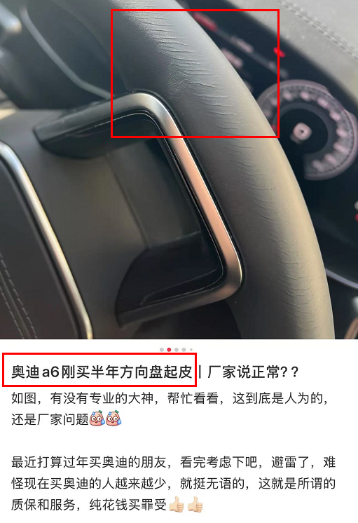 而关于方向盘皮质褶皱、龟裂的问题也常被车主爆出,最后多被4S店以"自然老化"、"车主使用不当"搪塞。