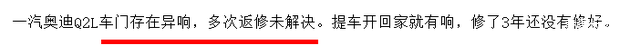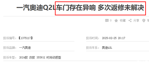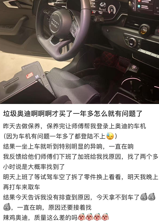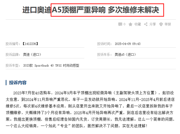 此外,若新车存在明显瑕疵且4S店未如实告知,车主还可主张相应赔偿。 希望奥迪可以积极与郝先生联系,协商解决方案。不过,回顾往期车主投诉,关于奥迪车辆异响的案例屡见不鲜。在第三方网站,一位奥迪A5车主反映:2023年7月购车,2024年9月顶棚异响,截至今年4月维修无果,问题反复出现。