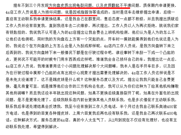 除此之外,提车就发现方向盘皮质存在明显褶皱,4S店起初承诺索赔,后又改口称索赔不了,可以维修修复,但至今仍未解决。
