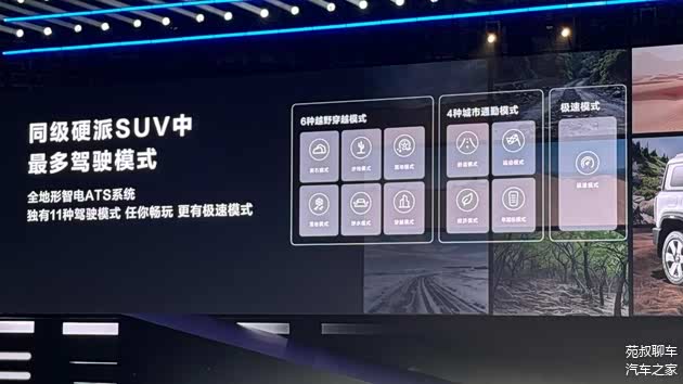 BJ40增程在越野方面,全系搭配三把锁和智能四驱控制系统,可以让BJ40增程爬上坡度100%的上坡,即45度,这样的能力让车辆在野外极端路况下,可以从容的面对更多定的场景。在驾驶模式方面,它提供了11种不同的选择,包括6种越野模式,4种城市模式,还有一个极速模式。