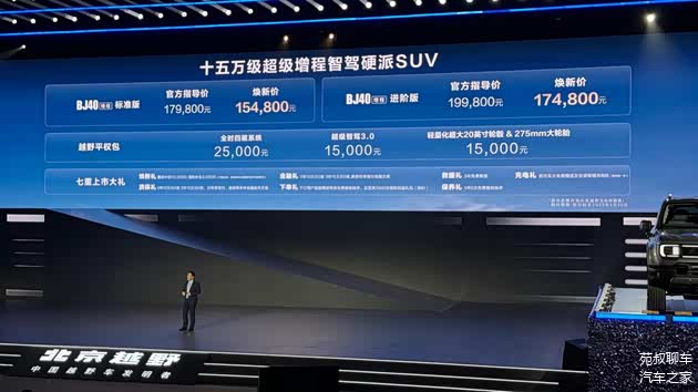 4月7日,北京越野BJ40增程在国家网球中心正式上市,共推出标准版和进阶版两款车型,官方指导价分别为17.98万元和19.98万元,同时在叠加国家补贴和置换补贴后的最低售价来到了15.48万元和17.48万元。同时BJ40增程还推出了价值55,000元的越野平权礼包,其中包含25,000元的全时四驱系统,价值15,000元的智驾3.0系统,以及价值15,000元的20英寸轮毂。
