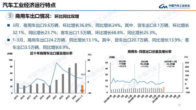 1-3月,商用车产销累计完成104.8万辆和105.1万辆,同比分别增长5.1%和1.8%。在商用车主要品种中,与上年同期相比,客车和货车产销呈不同程度增长。