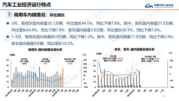 3月,商用车产销分别完成43.1万辆和44.7万辆,环比分别增长35.8%和42.8%,同比分别下降1.4%和2.4%。在商用车主要品种中,与上月相比,客车和货车产销均呈快速增长;与上年同期相比,客车产量小幅增长、销量微降,货车产销均呈小幅下降。
